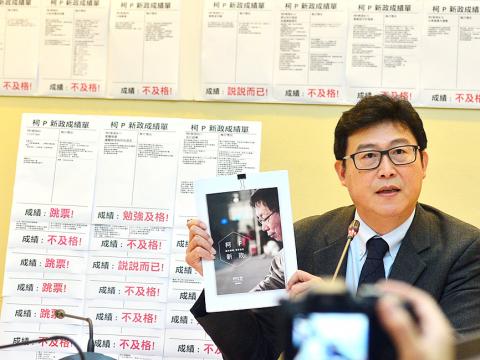 Taipei Mayor Ko Wen-je (柯文哲) has broken eight of his 30 campaign promises and achieved only unsatisfactory results for another 14, Democratic Progressive Party (DPP) Legislator Pasuya Yao (姚文智) said yesterday, questioning Ko’s capability as mayor.