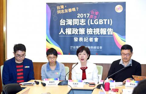 The Taiwan Tongzhi Hotline Association yesterday released its Taiwan LGBTI Rights Policy Review for last year — which it described as the first comprehensive report on the nation’s policies regarding lesbian, gay, bisexual, transgender and intersex (LGBTI) people — and which suggests ways to improve gender equality education and address hate crimes, workplace discrimination, same-sex marriage, long-term care and transgender and intersex peoples’ rights.
