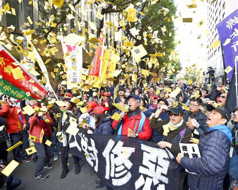Labor groups, including the Taoyuan Confederation of Trade Unions (TCTU), Taiwan Higher Education Union, the Hsinchu County Confederation of Trade Unions and the Confederation of Taipei Trade Unions, had been protesting the amendment since Monday by marching around the Legislative Yuan.