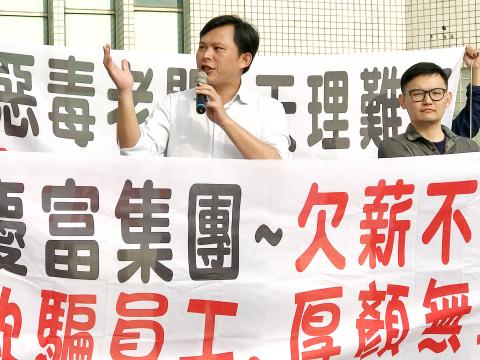 New Power Party Executive Chairman Huang Kuo-chang (黃國昌) and a dozen former and current employees of Ching Fu Shipbuilding Co (慶富造船) yesterday protested outside the company’s headquarters in Kaohisung’s Cianjhen District (前鎮) to criticize the government’s inaction over the company’s failure to pay salaries.