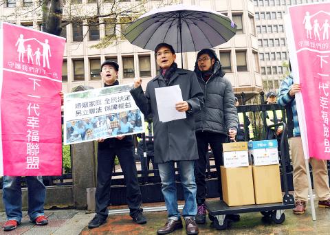 Members of the alliance, which was formed by the Alliance of Taiwan Religious Groups for the Protection of the Family (Family Alliance, 護家盟) and a handful of Christian groups, urged the government to let citizens jointly decide whether to legalize same-sex marriage, saying that most Taiwanese do not support changing the definition of marriage in the Civil Code.