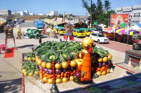 This year, the Jing Hai Temple (靖海宮) in Magong City’s Wukan Borough (烏崁) made a turtle out of locally grown cabbage. It also created an ocean-themed turtle made of coral and different shells.
