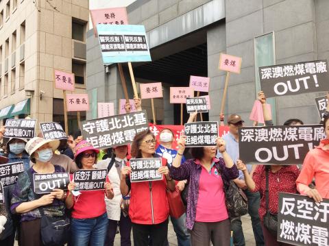 Environmental groups and local residents rallied in front of the Environmental Protection Administration (EPA) building in Taipei yesterday afternoon to protest an imminent review of a project to establish a new Shenao coal-fired power plant in New Taipei City.