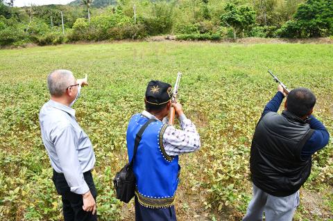 Manjhou Township Mayor Yu Tseng-chun (余增春) joined hunters Pan Jung-fu (潘榮富) and Fu Jen-yi (傅仁義) on Friday when they shot over a black soybean field that has been plagued by monkeys to highlight the establishment of a 25-member team of “field guardians.”