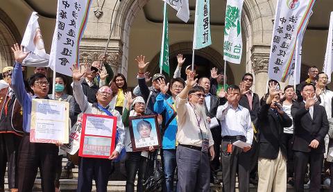 Members of the Taiwan Jury Association, along with members of judicial reform advocacy groups, yesterday gathered in front of the Judicial Yuan building, urging the public to join a march on May 5 to demand the implementation of the jury system in Taiwan.