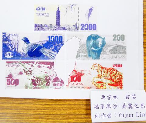 Winners of a banknote design contest held by Democratic Progressive Party Legislator Gao Jyh-peng (高志鵬) were announced yesterday, with a design titled Formosa — The Beautiful Island featuring indigenous wildlife and Taipei 101 winning the top prize.
