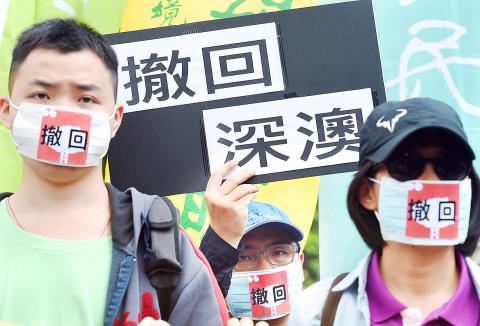 A number of environmental groups yesterday protested outside the Executive Yuan in Taipei to demand that the government withdraw its plan to open the rebuilt coal-fired Shenao Power Plant in New Taipei City.