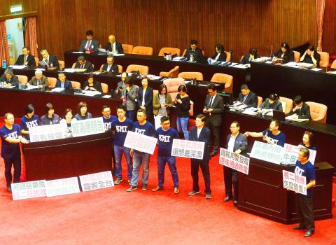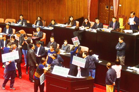 Shortly after a legislative meeting began, members of the KMT caucus flocked to and occupied a podium where Lai was scheduled to answer questions from lawmakers.