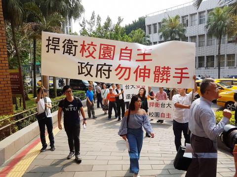 The protesters held banners that read “Safeguard university autonomy” and “How much longer must NTU take the insults?”