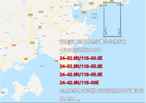 The tabloid, owned by Chinese Communist Party’s People’s Daily, said the exercise is to take place in a zone 20km from the coast of Quanzhou Bay (泉州灣) in Fujian Province. That would place it about 40km from Kinmen, the Global Times said.