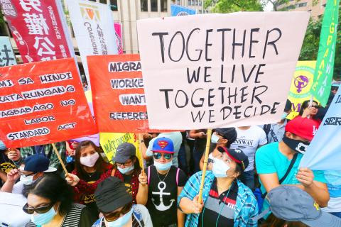 About 70 migrant workers and labor rights advocates yesterday held banners and shouted “live together, decide together” in a demonstration in front of the Central Election Commission office on Xuzhou Road in Taipei.