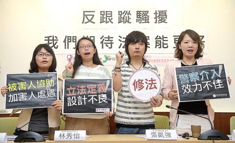 If someone is being stalked by a stranger, they can hardly know and therefore prove the stalker’s motivation, Awakening Foundation director of development Lin Shiou-yi (林秀怡) told a news conference at the Legislative Yuan in Taipei.