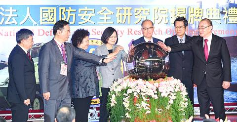 President Tsai Ing-wen, former minister of national defense Feng Shih-kuan (馮世寬) and other top officials yesterday in Taipei inaugurated the government-funded Institute for National Defense and Security Research think tank.