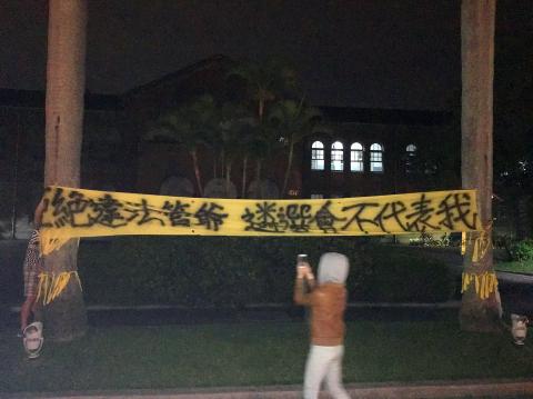 An NTU student, who wished to only be identified by his surname, Hsu (徐), said that not everyone at the school supported Kuan, so he and several other students at 3am or 4am yesterday hung up banners saying that they do not want a lawbreaker and that the university election committee does not represent them.