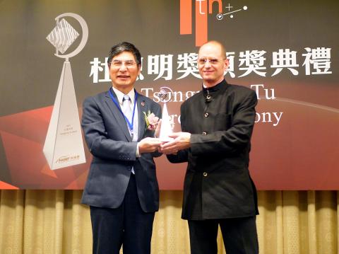 Minister of Science and Technology Chen Liang-gee (陳良基) yesterday presented German plant molecular biologist Wolf Frommer with the 11th Tsungming Tu Award, the nation’s highest academic honor for foreign researchers, at a ceremony at Academia Sinica in Taipei.