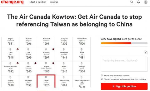 The petition, titled “The Air Canada Kowtow: Get Air Canada to stop referencing Taiwan as belonging to China,” was launched on Tuesday on the change.org platform and has gathered more than 3,400 signatures as of press time last night.