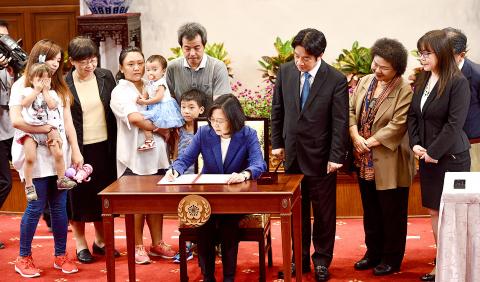 President Tsai Ing-wen (蔡英文) yesterday signed into law the Act on Savings Accounts for the Education and Development of Children and Teenagers (兒童及少年未來教育與發展帳戶條例) in a ceremony at the Presidential Office in Taipei.