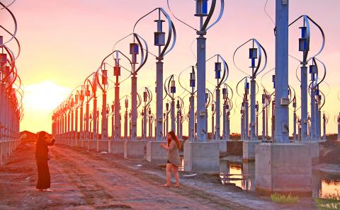 A wind farm comprised of 432 vertical-axis wind turbines on the coast of Changhua County’s Fangyuan Township (芳苑) has become the county’s latest tourist attraction.