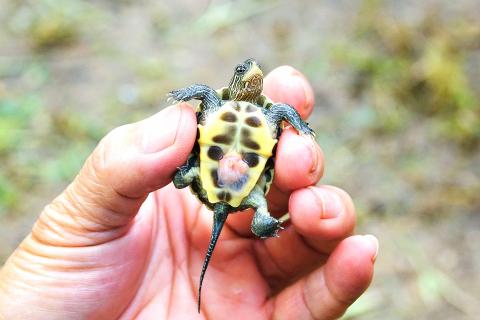 Two eggs from a clutch laid by a golden thread turtle, which is endemic to the Neiliao Wetlands (內寮濕地), hatched on Saturday, a sign that conservation measures to boost the species’ population is starting to bear fruit, volunteers in the area said.