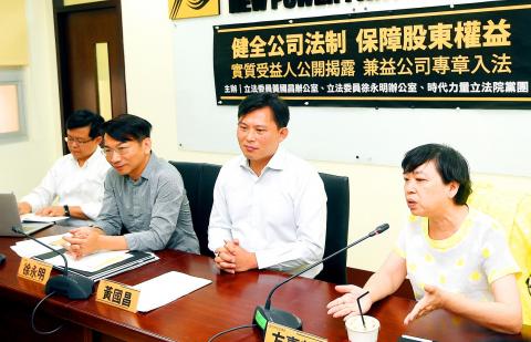The New Power Party (NPP) and civic group representatives yesterday called for rules requiring companies to disclose their beneficial owners and allowing minority shareholders to bring direct actions against board members ahead of a legislative review of draft amendments to the Company Act (公司法) planned for today.