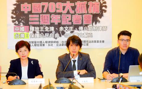 A coalition of human rights groups and Democratic Progressive Party (DPP) Legislator Yu Mei-nu (尤美女) yesterday called on Beijing to release the lawyers arrested in Beijing’s “709 crackdown” of 2015 as they marked its third anniversary.