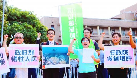 Environmental groups and Rueifang locals yesterday gathered in front of the Executive Yuan in Taipei, urging the Cabinet to revoke the EPA’s approval and scrap the project.