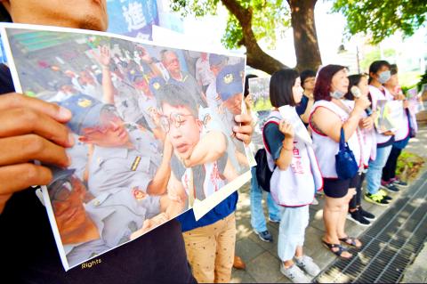 During Thursday’s demonstration outside the National Housing and Regeneration Center in Taipei, where President Tsai Ing-wen (蔡英文) attended a ceremony, protesters were violently dragged 200m to an area bordered by barricades and police officers after being told once to disperse, the protesters’ letter to the Control Yuan said.