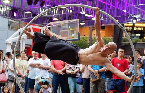The 37-year-old Taiwanese-American is a master of the metal Cyr wheel, whirling himself around while stretched out inside the ring. He performs on stage and television, but still busks, drawing crowds in spots throughout Taipei, mainly in Xinyi District’s (信義) shopping areas.