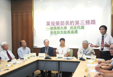 “Today is the beginning of a new semester, as well as Yeh’s two-month deadline. He has constantly talked about improving the selection regulations, but in the past two months, all we have seen him do is arrange secretive meetings with those who have broken the law,” NTU professor emeritus Ho De-fen (賀德芬) told a Taipei news conference yesterday.