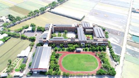 The school stands on the northern Chianan Plain (嘉南平原) in southern Taiwan, where sunlight is abundant, school principal Lin Yi-wen (林逸文) said, adding that installing solar panels has reduced the school’s carbon footprint and represents a more efficient use of floor space.
