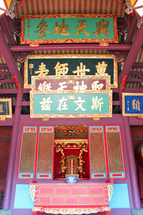 The eight tablets — which have adorned the temple’s main hall for centuries — were bestowed by generations of Qing emperors, from Kangxi (康熙) to Guangxu (光緒), Tainan Bureau of Cultural Affairs Director Yeh Tse-shan (葉澤山) said.