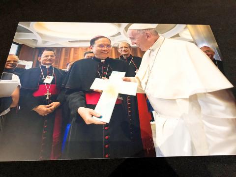 Chiayi Bishop Chung An-chu (鍾安住) said he exchanged greetings and handshakes with two Chinese bishops when the three men met during this month’s Synod of Bishops at the Vatican.