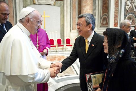 During a meeting with the pope before the ceremony, Chen extended an invitation on behalf of President Tsai Ing-wen (蔡英文) to visit next year, when the pontiff is scheduled to travel to Japan.