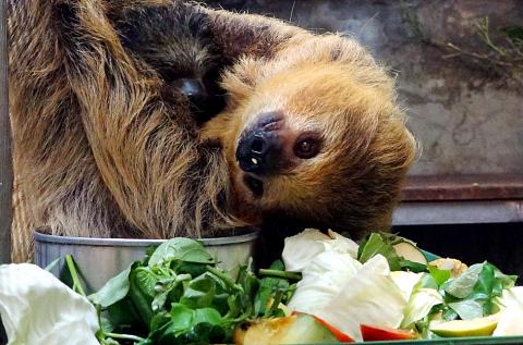 The Taipei Zoo yesterday moved a family of two-toed sloths to its Asian Tropical Rainforest area in celebration of International Sloth Day and to encourage people to appreciate a relaxed pace of life.