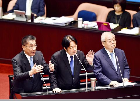 Premier William Lai (賴清德) yesterday gave a report to the Legislative Yuan on the central government’s budget for fiscal year 2019, saying that the total expenditures estimate stands at NT$2.2 trillion (US$71 billion) — an increase of NT$55.1 billion, or 2.8 percent, compared with fiscal year 2018.