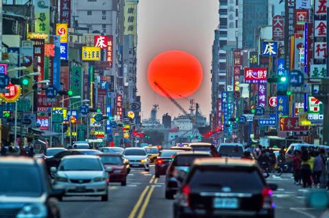 Twice a year in Kaohsiung, the sun sets where it aligns with the city’s east-west streets, Tourism Bureau Director Tseng Tzu-wen (曾姿雯) said, adding that a similar effect in Manhattan, New York City — which also has a grid layout — has been nicknamed “Manhattanhenge.”