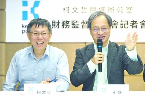 Taipei Mayor Ko Wen-je’s (柯文哲) election campaign office yesterday announced members of its financial supervisory committee and its campaign expenditures so far as Ko urged other mayoral candidates to follow suit.