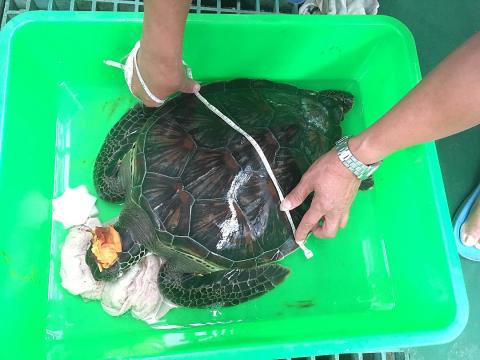 A fisherman took the turtle to the center after finding it injured and floating near the shore in Siyu Island (西嶼) in Penghu County.
