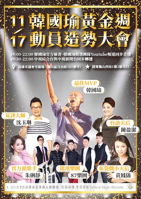 To seize the last remaining weekend days to campaign for votes, Han is to hold a campaign event from 7pm to 10pm today in Fongshan District (鳳山).