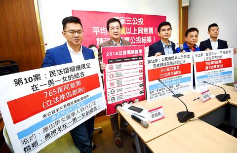 The Executive Yuan’s proposal to legalize same-sex unions by drafting a separate law would go against the result of a referendum passed last Saturday that asked: “Do you agree that the right to persons of the same sex to create a permanent union should be guaranteed by an institution other than marriage as defined by the Civil Code?” the Happiness of the Next Generation Alliance said yesterday.