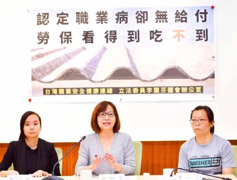 Such cases are especially common among people with malignant mesothelioma — a cancer of the thin tissue that covers the lung, chest wall and abdomen, which is linked to exposure to asbestos — because its symptoms typically do not show until decades after exposure and those affected might have canceled their labor insurance plan due to retirement, Lee told a news conference at the Legislative Yuan in Taipei.