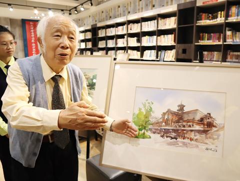 Artist Sun Shao-ying’s (孫少英) watercolor paintings, which depict historic parts of Taichung, are on display at the city’s Hong Wen Senior High School until Dec. 22.