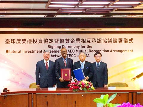 Taiwan and India yesterday signed a new bilateral investment agreement (BIA) and a treaty to mutually recognize respective authorized economic operation (AEO) programs, the Ministry of Foreign Affairs said, touting them as major achievements in the government’s New Southbound Policy.