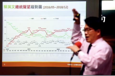 A Taiwanese Public Opinion Foundation poll has shown that the approval ratings for President Tsai Ing-wen (蔡英文) and Premier William Lai (賴清德) hit a new low following last month’s nine-in-one elections, foundation chairman You Ying-lung (游盈隆) said yesterday, adding that if he were elected party chairman, he would make sure the Democratic Progressive Party (DPP) understood what the public wants and met the needs of Taiwanese.