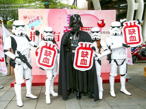 The center and the Rotary Club of Taipei at a blood donation event at Warner Village Cinema in the city’s Xinyi District (信義) encouraged people to “roll up their sleeves” to help others.