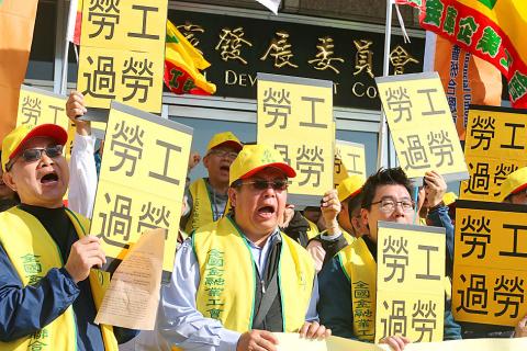 A coalition of trade unions yesterday demonstrated outside the National Development Council in Taipei, protesting what it called the council’s attempt to pressure the Ministry of Labor into imposing a salary threshold that would allow employers to subject some employees to a responsibility-based scheme and could aggravate overwork.