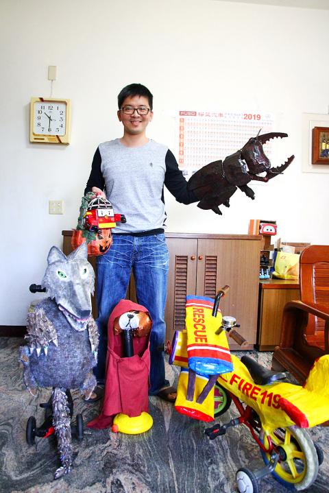 Chiayi County firefighter Huang Ta-yu (黃達育) has remodeled a bicycle into a model firefighting aircraft in celebration of Firefighters’ Day on Saturday.