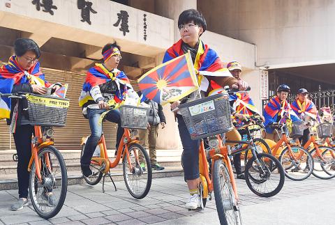 Advocates flying Tibetan flags yesterday biked around Taipei to raise awareness for human rights issues in Tibet ahead of the annual Tibetan Uprising Day march.