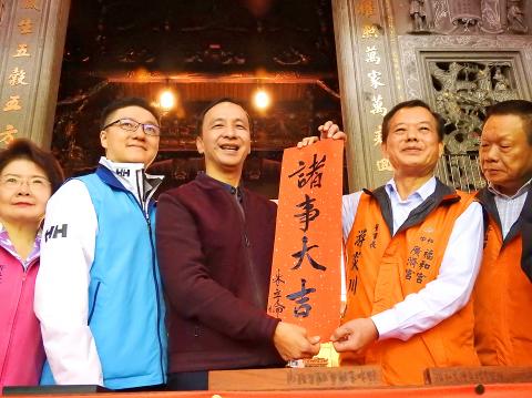 Former New Taipei City mayor Eric Chu (朱立倫), the first from the KMT to declare his intention to run for president next year, has sent out 350,000 copies of a couplet that reads: “Good fortune in everything” (諸事大吉), Chu’s office said on Sunday, adding that it is having an additional 100,000 couplets printed.