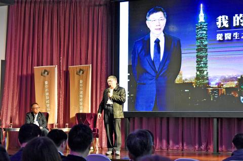 Ko made the remark in a speech at the Taichung Architecture Development Association on the second day of a Taichung trip that included visits to the Dajia Jenn Lann Temple (大甲鎮瀾宮) and Fengchia Night Market (逢甲夜市) on Friday night, as well as a fan event and a meeting with Taichung Mayor Lu Shiow-yen (盧秀燕) at the Taichung World Flora Exposition yesterday.